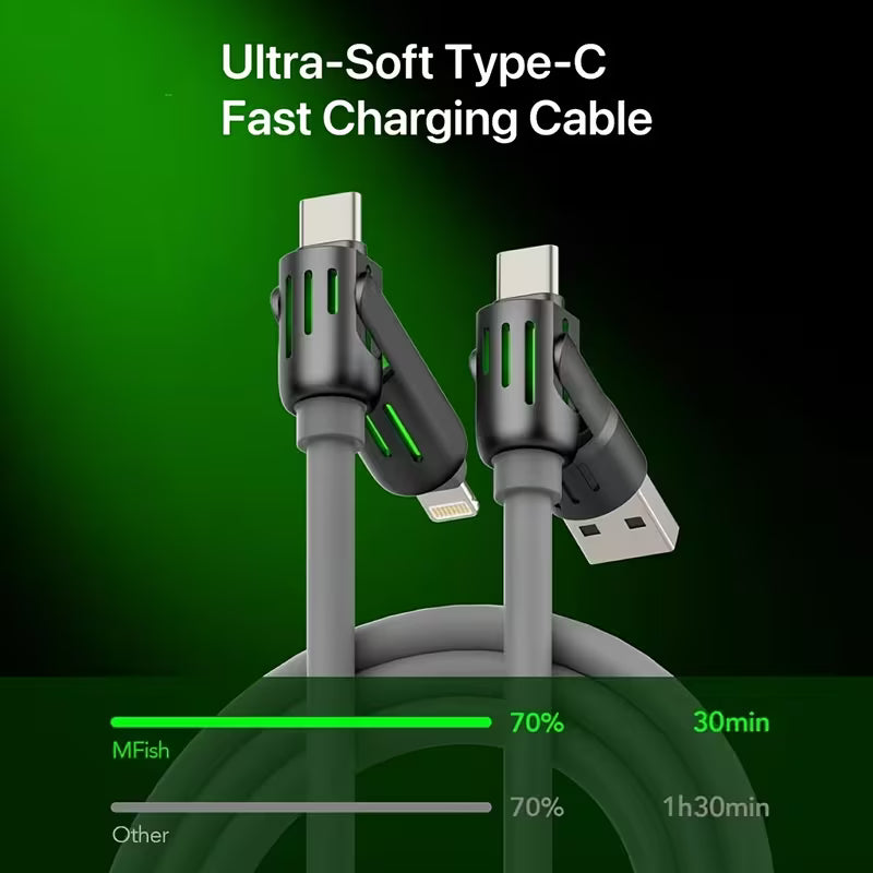 This 4-in-1 cable is super convenient. I no longer need to carry multiple chargers for my devices. It charges fast, feels durable, and works perfectly with my iPhone, power bank, and Android tablet.